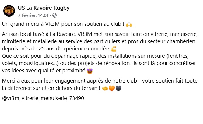 Chez VR3M, nous sommes fiers de soutenir le club USR de La Ravoire 🏉.